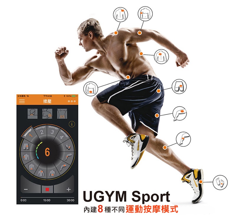 UGYM Sportè¨è¨ˆçš„8個é‹å‹•按摩模å¼å¯æ‡‰ç”¨åœ¨è…³åº•ã€å°è…¿ã€å¤§è…¿ã€èƒŒéƒ¨ã€è‚©éƒ¨ ã€è…¹éƒ¨ã€ä¸Šè‡‚ã€å‰è‡‚ã€è‡€éƒ¨ç‰éƒ¨ä½ã€‚éŽåŽ»æœ‰ç ”ç©¶æŒ‡å‡ºæ£ç¢ºçš„é‹å‹•按摩能有效æå‡è‚Œè‚‰å¼·åº¦ï¼Œè‹¥åŒæ™‚çµåˆé˜»åŠ›è¨“ç·´å¯å¤šå¢žåŠ è‚ŒåŠ›ã€‚UGYM Sport app æä¾›è‡ªè¨‚模å¼çš„åŠŸèƒ½ï¼Œå¯æé…出最é©åˆè‡ªå·±çš„æ¨¡å¼ä¸¦åˆ†äº«çµ¦æœ‹å‹ã€‚