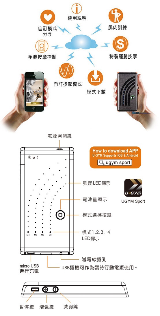 按摩模å¼è¨å®šå’Œå¼·å¼±é¸æ“‡é™¤äº†å¯ä»¥åœ¨æœ¬æ©ŸæŽ§åˆ¶ï¼Œå¦å¤–也å¯èˆ‡æ‰‹æ©Ÿè—芽連線用UGYM Sport App控制。內建3200mAé‹°é›»æ± ï¼Œå……é£½æœ€é•·å¯ç”¨8å°æ™‚,也å¯åšè‡¨æ™‚行動電æºä¾†ä½¿ç”¨ã€‚
